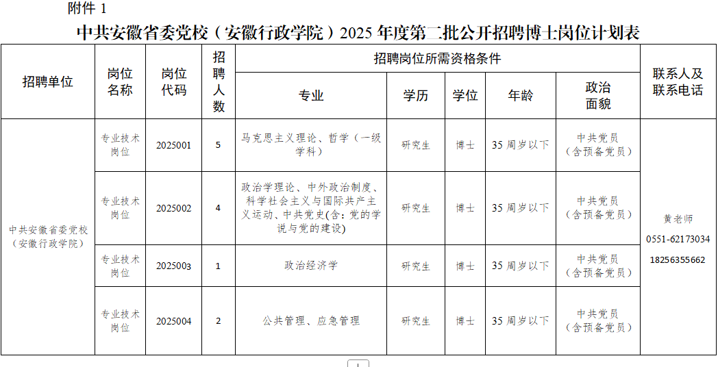附件:1中共安徽省委黨校(安徽行政學(xué)院)2025年度第二批公開招聘博士崗位計(jì)劃表